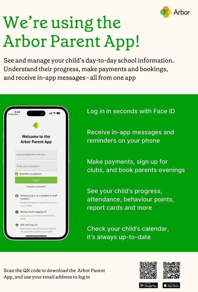 All payments for Breakfast and After School Club, trips and clubs need to be made on the Arbor app.
